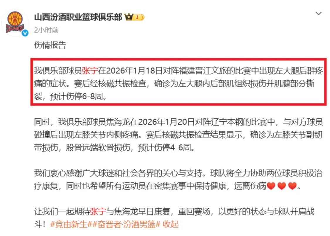 据山西男篮官宣,张宁的左侧大腿后肌群出现了损伤,肌腱部分撕裂,一动就疼,因此他必须开始休养,预计伤停6到8周的时间。山西男篮毫无疑问会非常困难,他们本赛季失去了主力外援古德温,球队没有合格的控球后卫了。